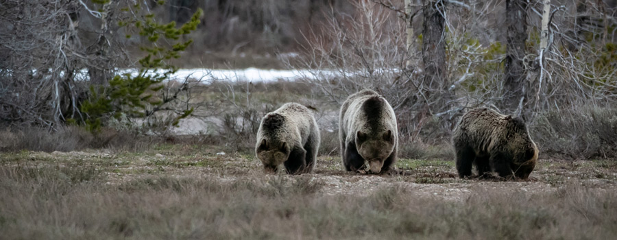 Bears have their cubs during hibernation and when they come out of hiding in the spring they will have one to five cubs in tow. Locally we generally see one to two cubs. The cubs will stay with them for two years while they learn to forage and fend for themselves. With both grizzly and black bears in the area, there is a high chance of seeing them in Jackson Hole. This year the famous grizzly bear 399 has already been seen with her two cubs born last year. Bear 399 is famous because she can often be seen from the roadway in Grand Teton National Park. When a sow has cubs, she is not mating. Male bears, called boars, are likely to attack cubs and try to kill them to make the sow available for mating again and to defend their territory. It is theorized 399 stays close to the roads because it protects her and her cubs from male predation.